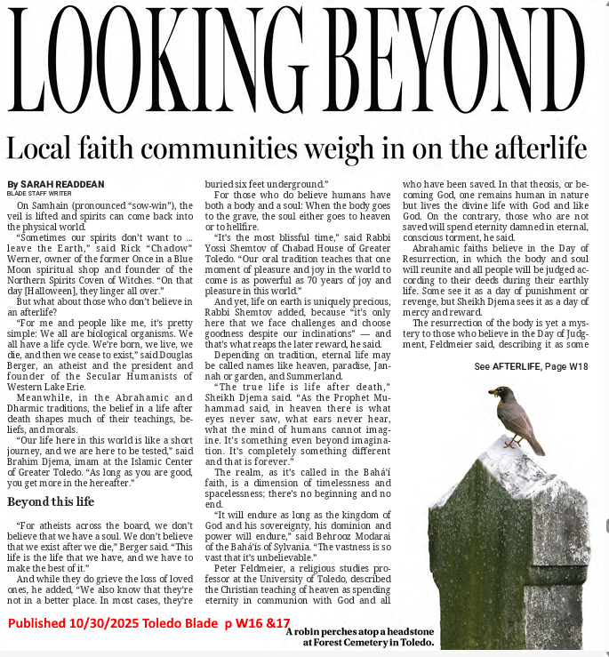 SHoWLE President Douglas Berger added the Humanist view on the afterlife in a story published in the Toledo Blade. Instead of the usual footnote at the end of a religious focused article, his comments open the article (for a pdf version if you aren’t a subscriber click here)